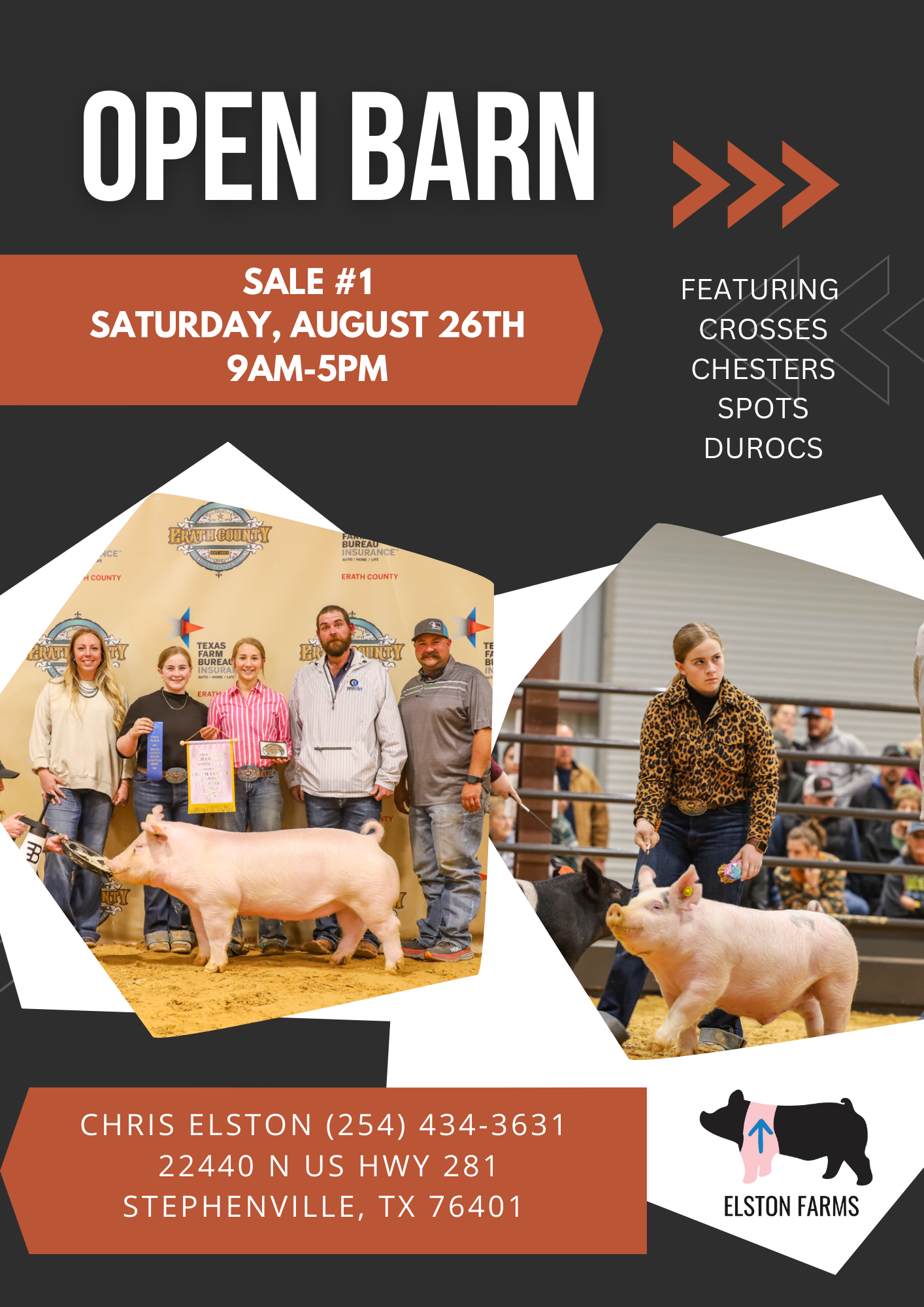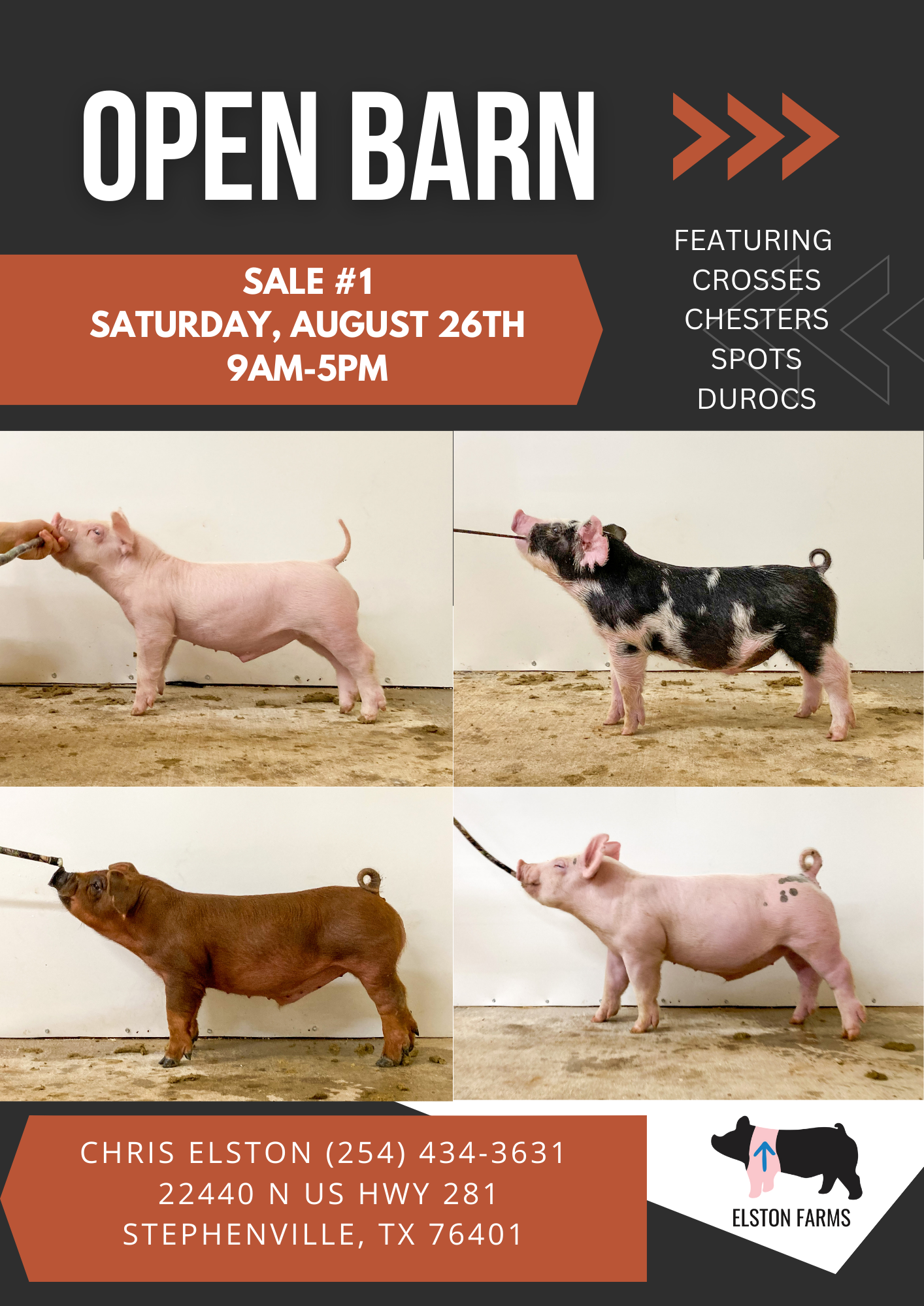 Our barn opens at 9am & it’ll be first come first serve style, no bid board. Pigs will be sorted into pens depending on cost/quality. We’ll accept check, cash or Venmo. Receipts for your purchase will be emailed/mailed depending on your preference. Registration/papers for purebred pigs will follow later in the mail with regular processing times for NSR & CPS Swine. If you have questions or need directions, call/text Chris at (254) 434-3631.