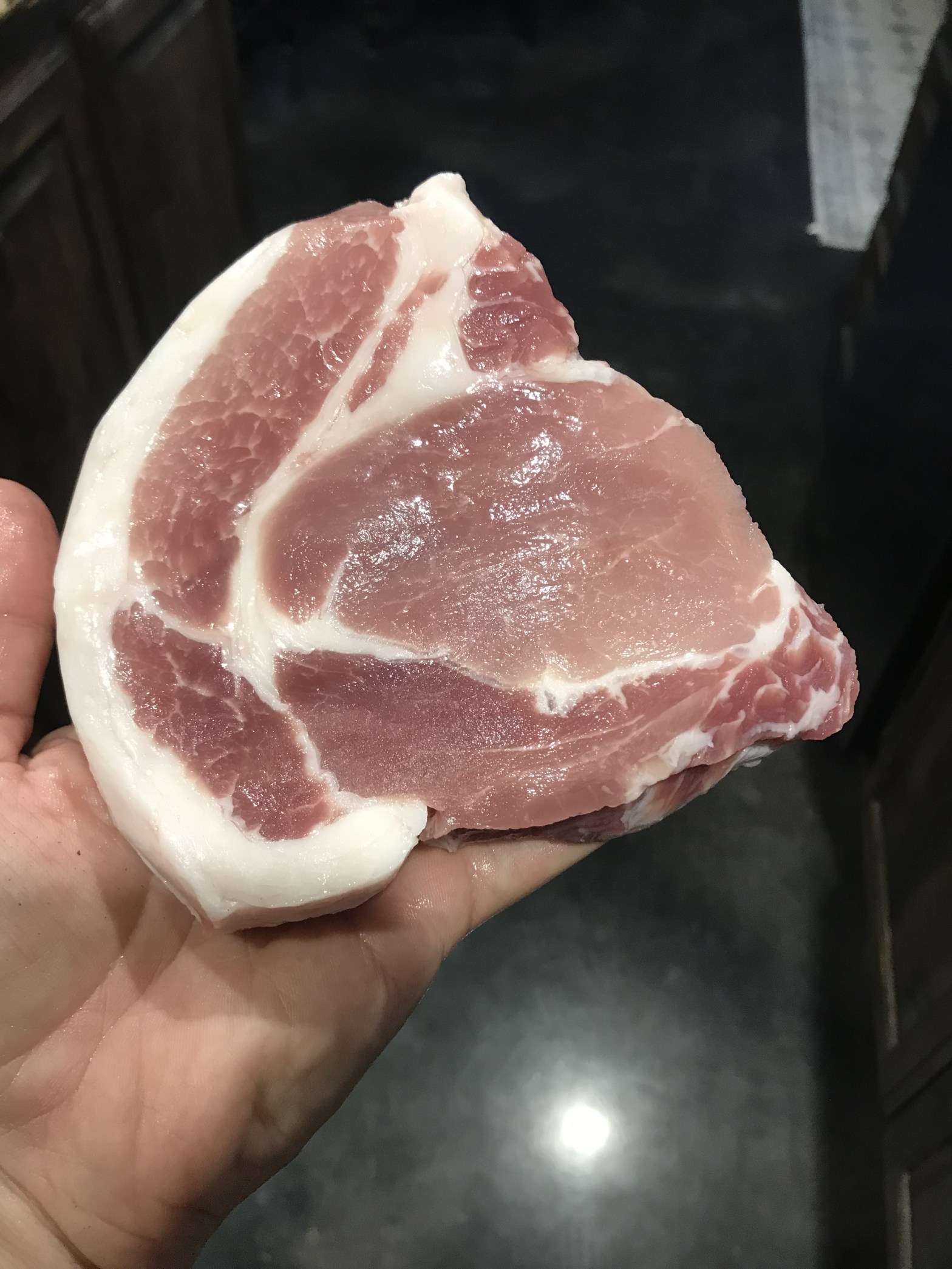 The last pig we took to the processor for our own consumption was 250lbs live weight/175lbs hanging weight for a total of $335 in processing fees. That’s a lot of meat. Our cuts included ground pork, ground breakfast sausage, jalapeño cheddar links, pork loin, pork loin chops, tenderized cutlets, jowls & hocks, and bacon.