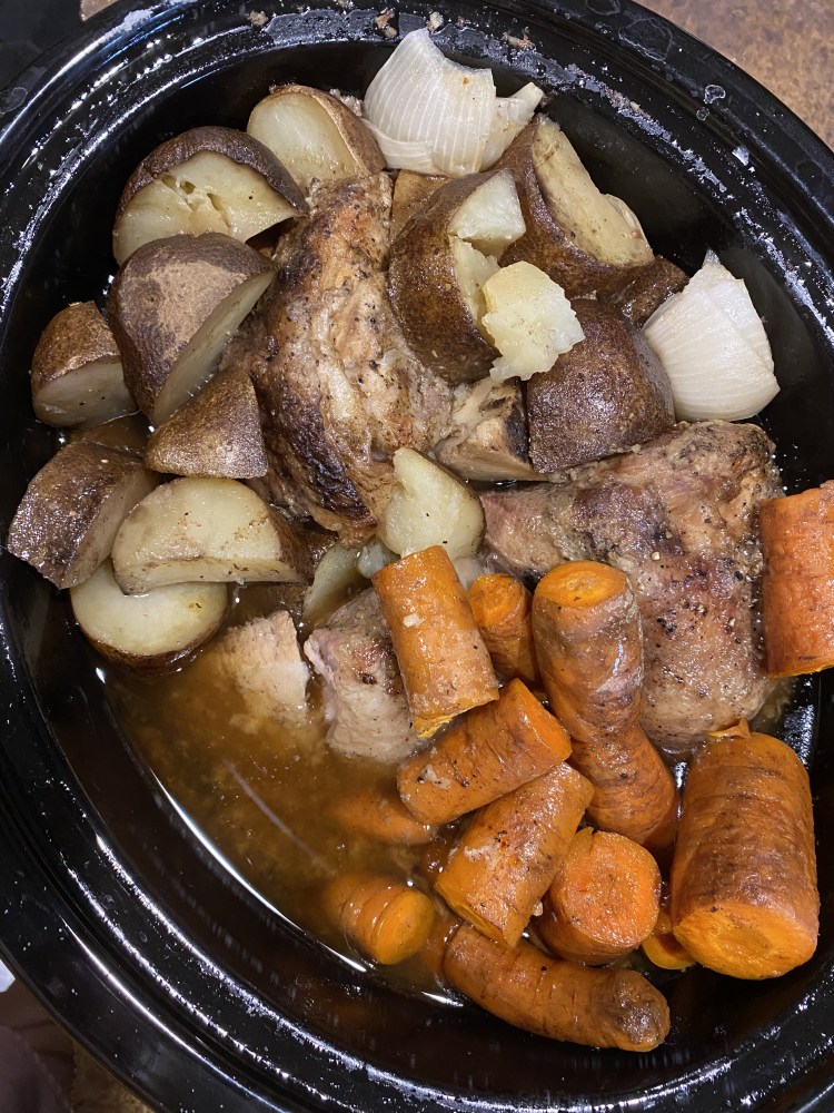 Heat your cooking oil in a pan/pot on the stove – say medium heat. Salt & Pepper your thawed pork hocks, then dredge them in the flour. Put your hocks in the hot pot with oil, and let it simmer /form a light crust on each side, turning them as needed to get everything braised the best you can. Remove hocks to a large crockpot, and return to the hot oil pot, adding garlic & rosemary. Stir vigorously & then deglaze this oil/flour/garlic/rosemary combination with 1/4-1/2 cup of Apple Cider Vinegar. It’s going to steam & make all kinds of noise, but keep stirring & then quickly remove from heat. Pour the contents of the pot over your pork hocks in the crock pot & add 1 quart of beef or chicken broth. Cover & cook on low heat for 4 hours. At the end of 4 hours, add in your cut vegetables to the crockpot, cover and cook on low for another 4 hours. You should be able to easily pierce the vegetables with a fork when they are finished cooking.